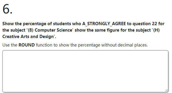 - 查询 来自'(8) Computer Science' 和'(H) Creative Arts and Design' 专业的学生,在回答问题22(Q22)时,表示强烈同意(A_STRONGLY_AGREE)的各专业人数占比