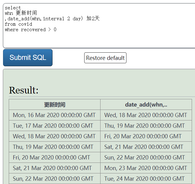 - 例如:date_add('2021-06-01',interval 2 day),向日期函数2021-06-01加了2天,返回值2021-06-03