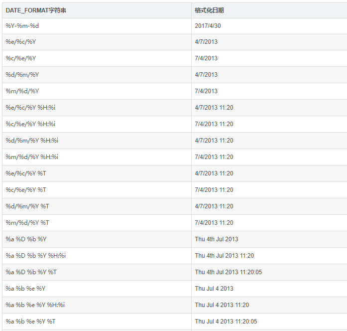 - date_formate用于以不同格式显示日期/时间数据。date 指合法的日期字段,format 规定日期/时间的输出格式,记得格式外加单引号
