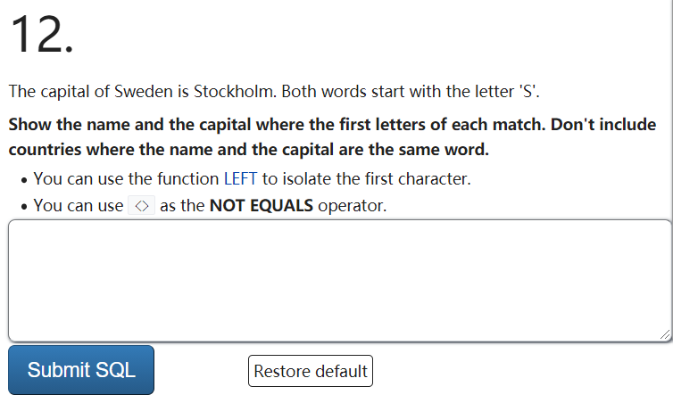 - 查询国家名称及其首都名称都以相同的字母开头的国家名称及其首都,且不能包括国家名称和首都名称完全相同的情况