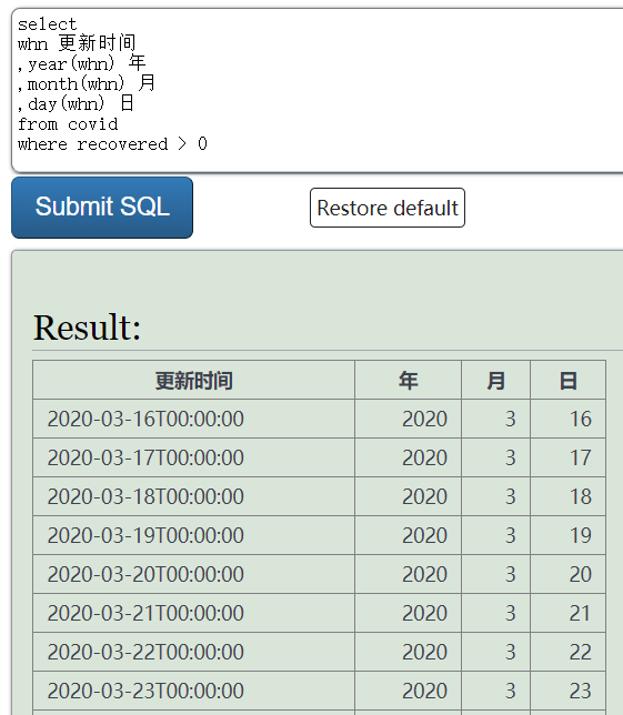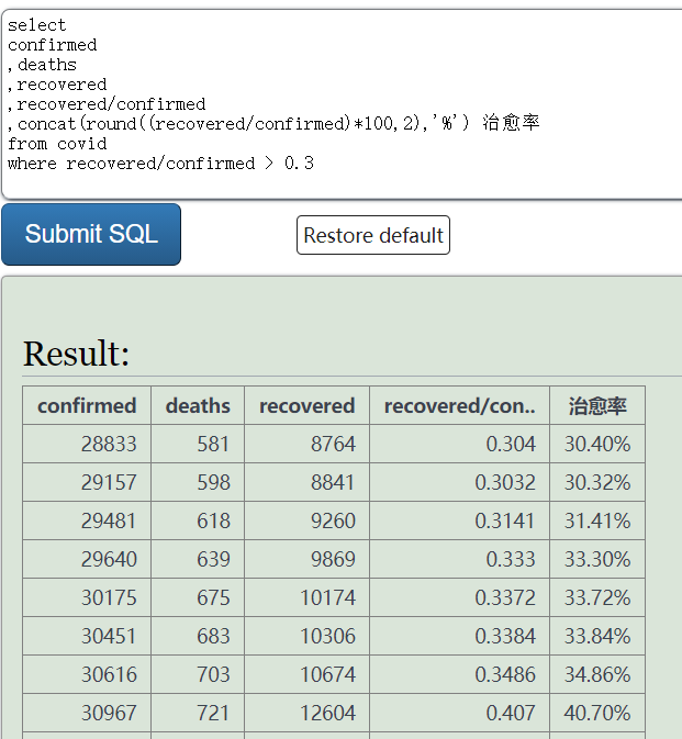 - ,concat(round((recovered/confirmed)*100,2),'%') 治愈率