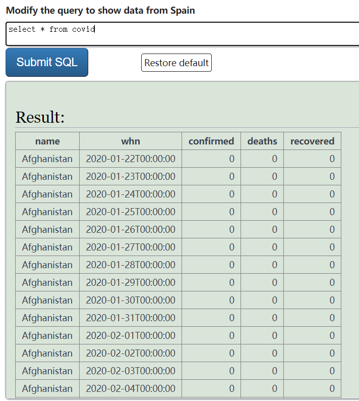 - 观察本表数据,记录了国家(name)截至时间(whn)的累计确诊(confirmed),累计死亡(deaths),累计治愈(recovered)