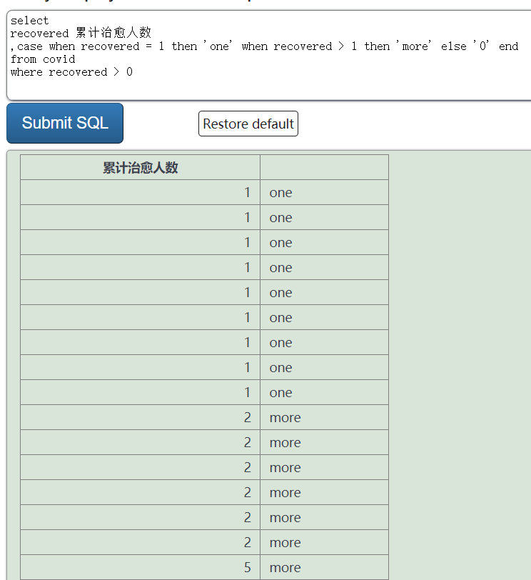 - ,case when recovered = 1 then 'one' when recovered > 1 then 'more' else '0' end