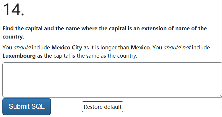 - 例如:答案中应该包括墨西哥城(Mexico City),因为它比墨西哥(Mexico)更长,而不应该将卢森堡(Luxembourg)包括在内,因为首都名与国家名相同