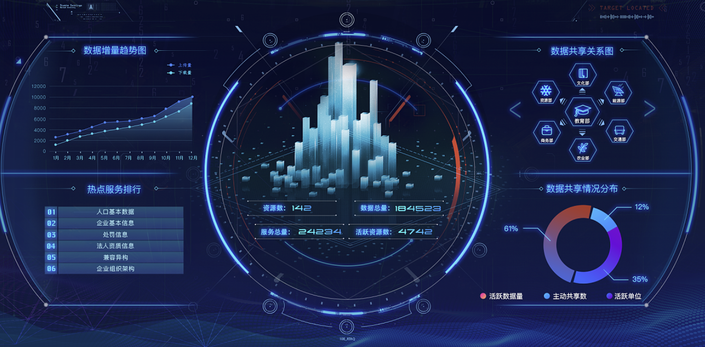 (4)可视化大屏:可视化大屏是将数据以图表或仪表盘的形式展示在大型显示设备上。它通常被用于监控中心、会议室、指挥调度中心等环境,可以实时展示重要业务指标和运营状态,并支持交互操作和预警功能。
