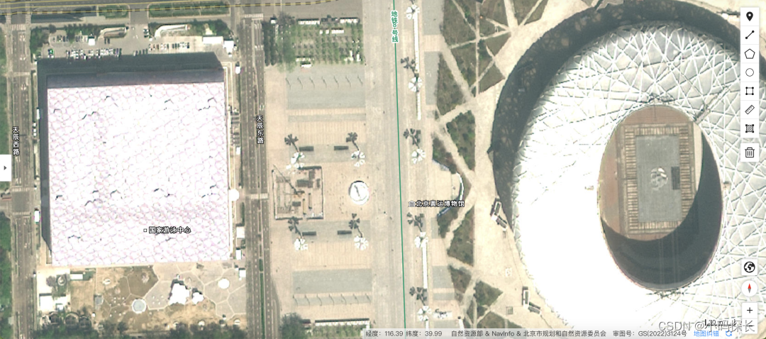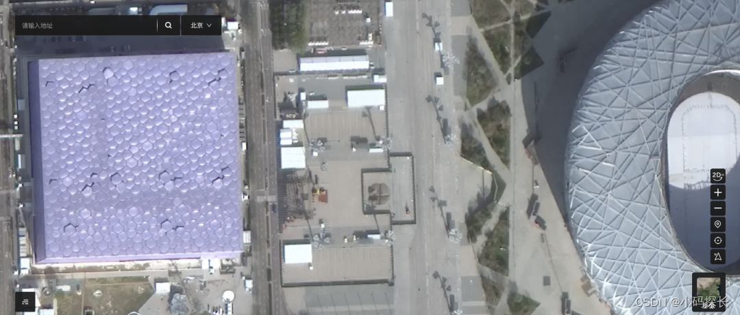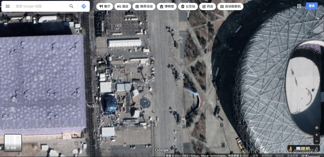 第二个对比场景选择了北京的水立方和鸟巢附近,从上到下依然分别是:天地图、星图地球数据云以及谷歌地图,细节表达上依然是谷歌的最好,颜色表达上则星图地球数据云的颜色比较舒服一些,谷歌太暗、天地图太亮。