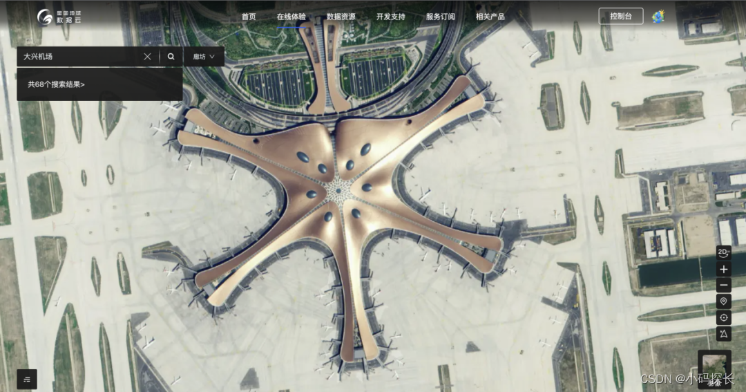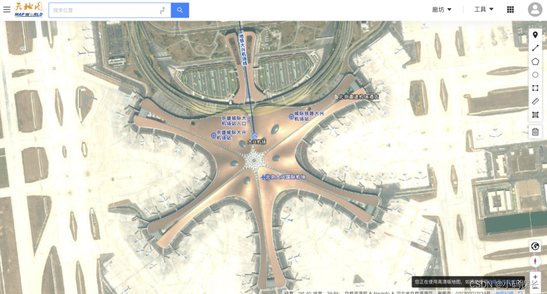 第三个对比场景选择了北京大兴机场。第一张图是星图地球数据云,第二张图是天地图。很明显,星图地球数据云的影像精度和颜色处理上更好些。