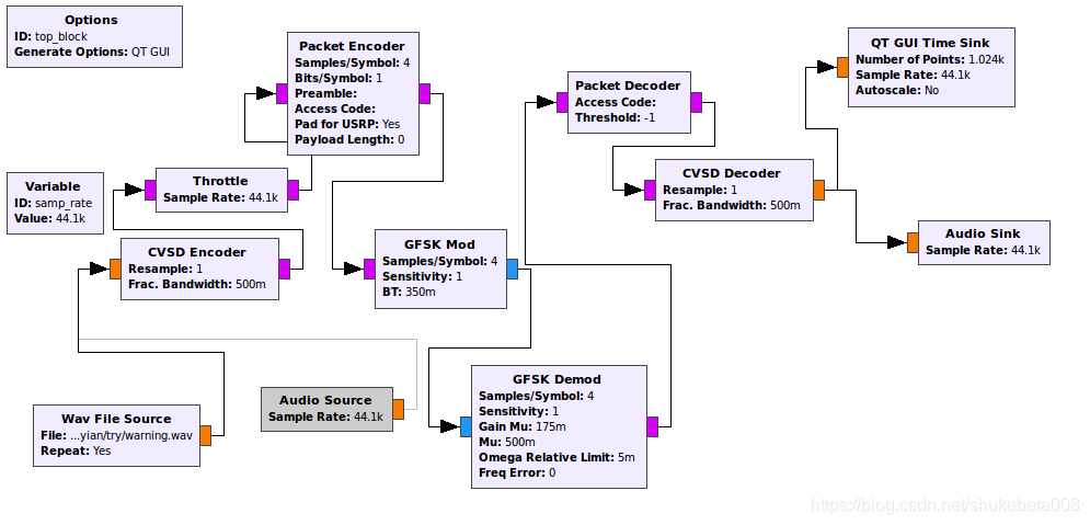 下面的流图可以实现本地回环,可以听一下声音是不是录音文件里的,其中采样率必须等于wav文件实际采样率,要不然声音会有问题,可以查看wav的详细信息,观察采样率和通道数,我用的wav是44.1kHz的采样率,单声道音频。如果是多声道的wav file source里要选2个通道,然后多出来一个接到null source上。我可以听到录音文件里的声音,如果把wav file source换成signal source并且发生正弦波,也可以听到对应声音,但是接audio source就不行。