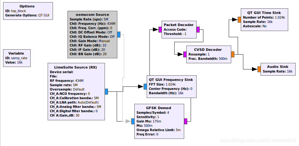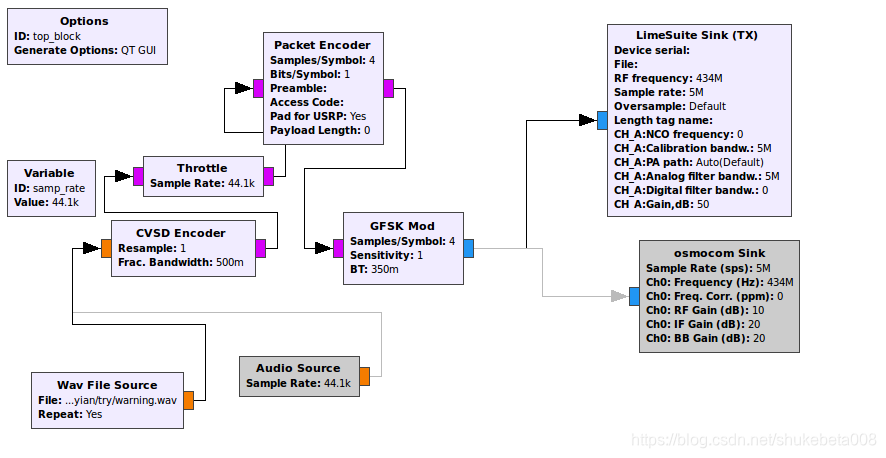 下面是我把loop back流图拆开后接入真实无线电设备的2个流图,可以把一台电脑的wav里的声音发到另一台电脑上并实时播放。如果没声音可能收发端之间要距离近一些。