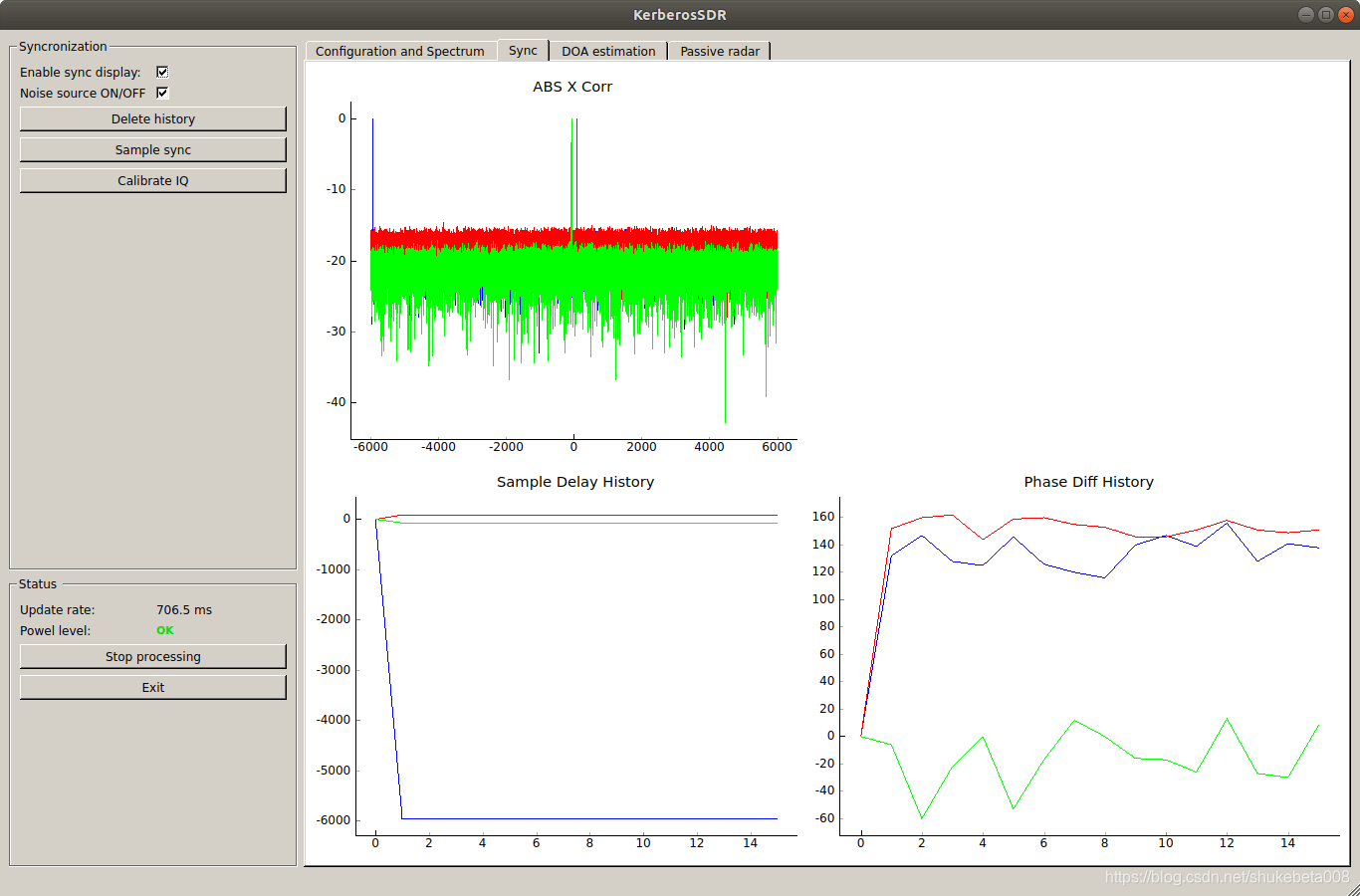 你可以看到ABS X Corr(互相关的模)上有3个尖峰,并且下方Sample Delay History(采样延迟历史)和Phase Diff History(相位差历史)上的值都不是0。这表示4个通道都没有同步。