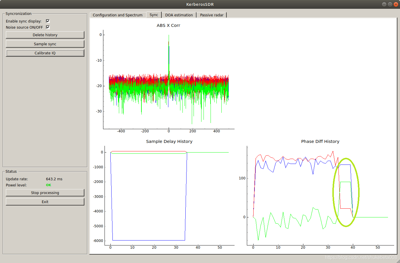 这时候点击Sample Sync(采样同步),稍等一会,ABS X Corr上的3个尖就会重合到中间位置,并且Sample Delay History的3根曲线变为0 ,这说明现在4个通道都没有采样时间差了,Phase Diff History也会有变化,从杂乱无章变为3根恒定的直线,说明相位差还是存在但是变为了一个常数值,(参见下图黄色圈中的部分)。