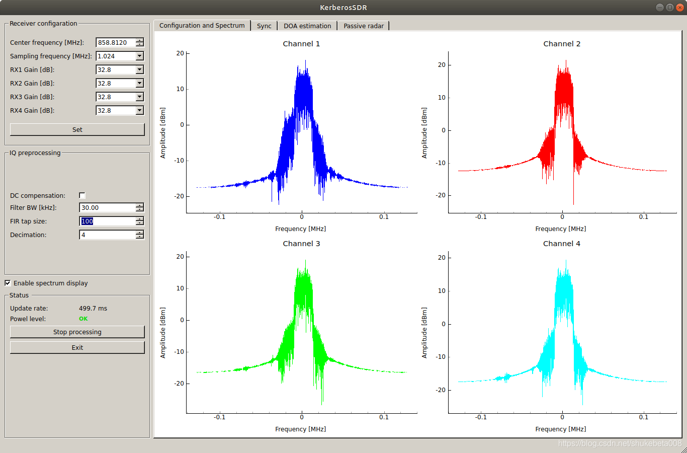 先要设置center frequency也就是中心频点和sampleing frequency也就是采样率,中心频点就是你要找的目标信号的频率值,采样率如果是测向推荐使用1MHz,我习惯用0.9MHz。Gain是4个接收机增益,我习惯统一设置为28,你可以自己调节,但它必须设置在15.7以上否则无法同步。点击Set按钮,这样程序会把这些设置下发给设备。你可以选择DC compensation,它会提升测量效果,不是一定要选的。你可以勾选enable spectrum display来观察4个通道上收到的信号。看完了就可以关掉这个显示,可以降低CPU占用率。