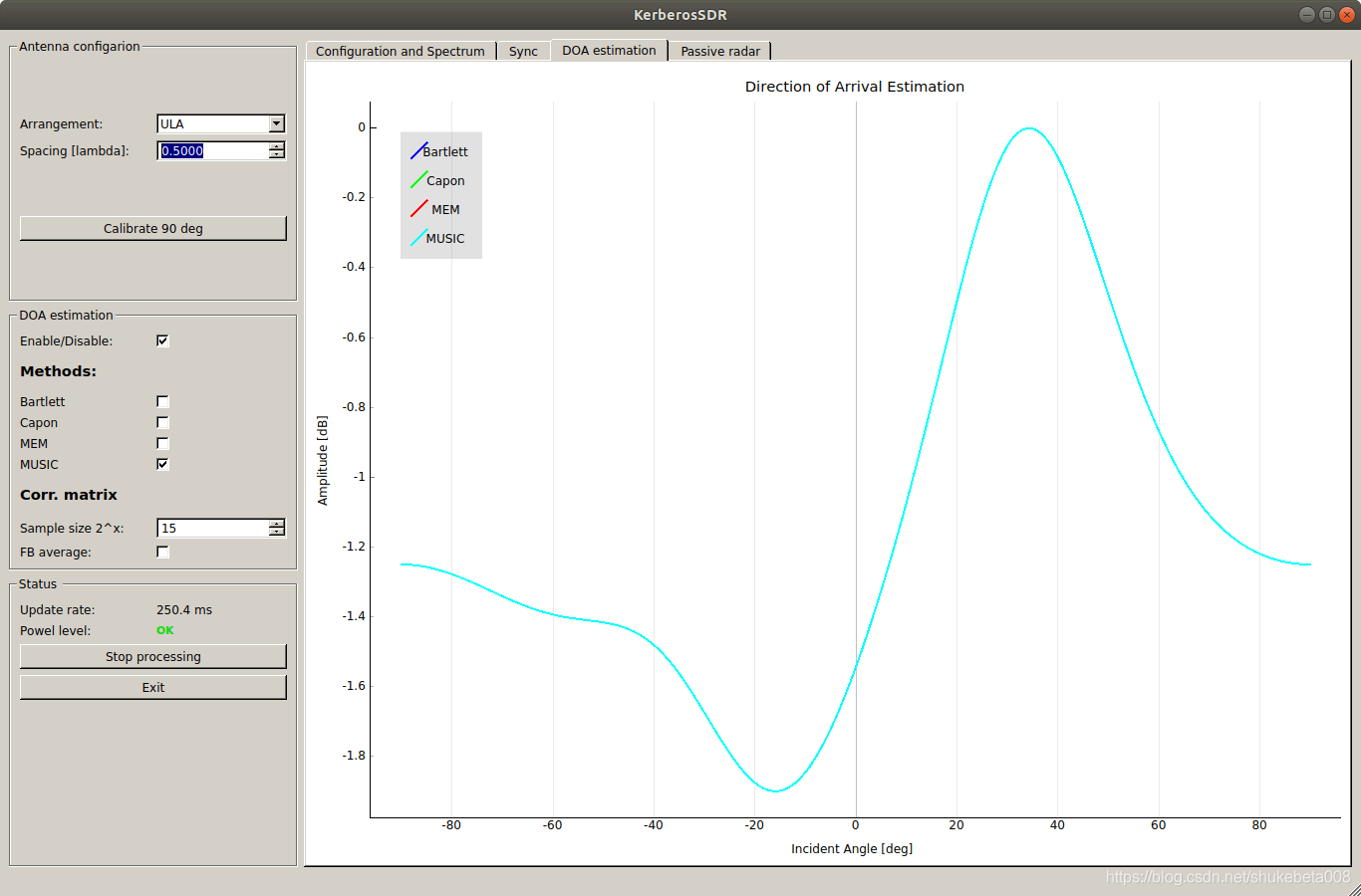 先选择ULA(均匀线阵)还是UCA(均匀圆阵),Spacing里填写的值是根据天线间距和中心频率换算出来的,最佳值是0.33,但在0.1~0.5范围内都是可以的。然后选择一个DOA算法,效果最好的是MUSIC算法。这样你就能看到图像了,最高值对应的横坐标就是测出的角度。UCA可以分清平面内0~360度的角度,ULA只能分清0~180度的,分不清前后,但是ULA受多径效应影响比UCA小,如果用ULA,可以打开FB average模式,进一步减少多径影响,但是kerberos的安卓APP的定位功能只支持UCA,所以我一般使用UCA。