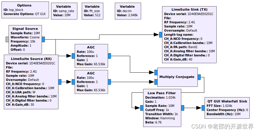 这个流图其实很简单,两个AGC模块是自动增益模块,可以忽略不计看作是2根线。这样一来,就相当于是一个余弦波的信号源直接从limesdr发射到了空中,另外这个余弦波信号源也与limesdr从空中收到的信号一起传入了Multiply Conjugate模块,这个Multiply Conjugate模块就是把两个信号相乘的意思,功能和混频器一样,出来的结果经过低通滤波(也可以忽略不计看成1根线),然后再送到瀑布图里显示,瀑布图内部其实有FFT实现,把时域信号做了FFT变换后显示在图像上。