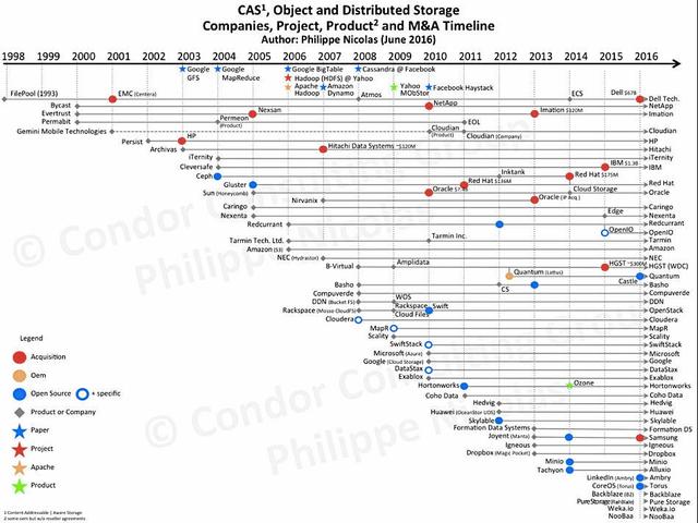 在《存储系统形态之争,从块存储到统一存储》一文中我们提到了对象存储的概念,知道目前很多企业级存储都是支持对象存储的,比如EMC、NetApp和华为等。以EMC的对象存储为例,其最早在1998年就已经具备成熟的产品了,到目前已经有二十多年的历史了。如图是关于对象存储主要产品的发展时间线。