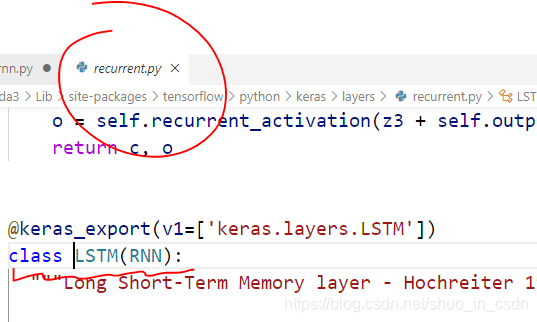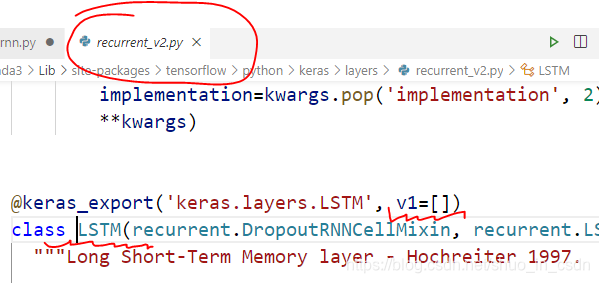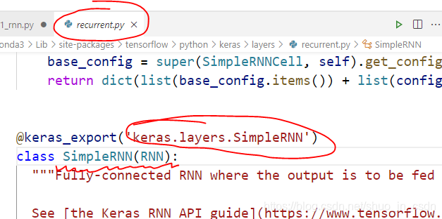 按住 Ctrl,点击两个类名 SimpleRNN 和 LSTM,进入定义的模块,会发现 from tensorflow.keras.layers import SimpleRNN 的 SimpleRNN定义所在的模块分别是这样的