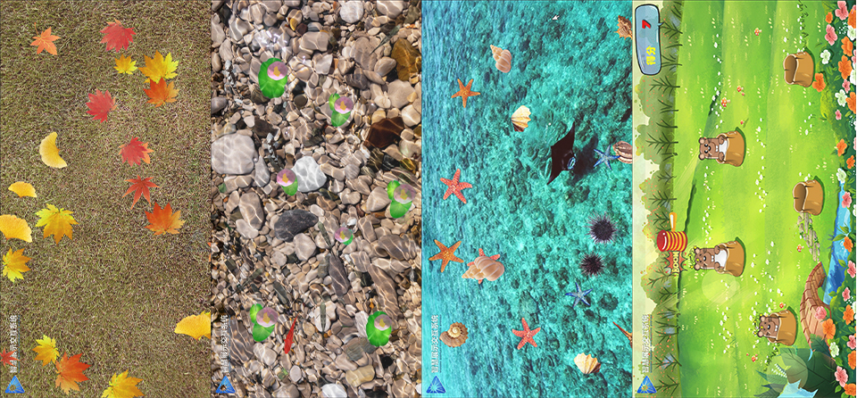 ▲内置多种预制模式附送,可供选择,包括:草地、鱼池、落叶、冰雪、海滩、踢足球、向日葵、打地鼠、打气球等。