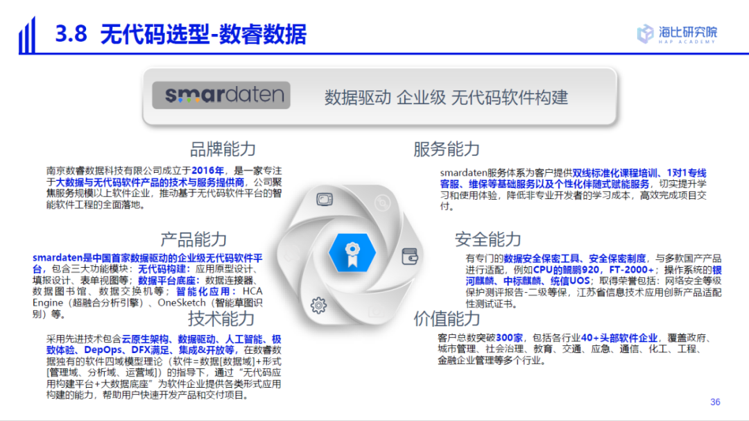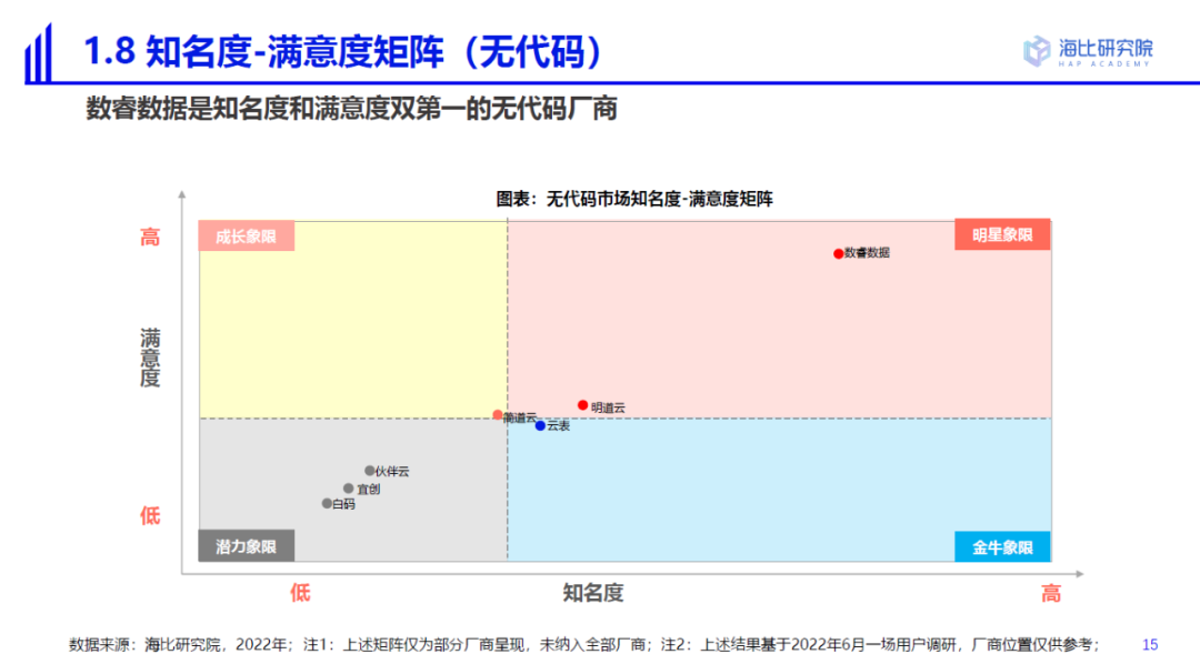 2022年,数睿数据作为中国首家数据驱动的企业级无代码软件平台,在无代码厂商中获得了知名度和满意度双第一。在品牌能力、产品能力、技术能力、服务能力、安全能力和价值能力方面,优势明显。