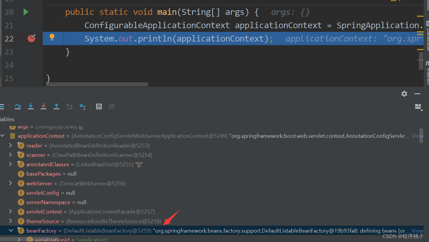 另外值得注意的是ApplicationContext中组合了BeanFactory对象作为它的成员变量,可以用Debug的方式看到在applicationContext对象中有beanFactory成员属性。