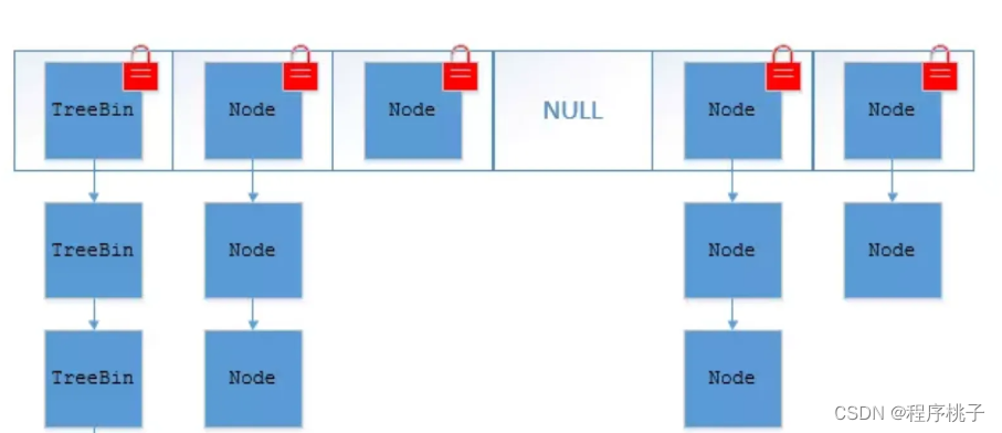 如上图所示,JDK1.7中ConcurrentHashMap是由Segment数组结构和HashEntry数组结构组成。Segment是一种可重入锁(ReentrantLock),在ConcurrentHashMap里扮演锁的角色;HashEntry 则用于存储键值对数据。一个ConcurrentHashMap里包含一个 Segment 数组。Segment 的结构和HashMap类似,是一种数组和链表结构。一个 Segment 里包含一个HashEntry数组,每个 HashEntry 是一个链表结构的元素,每个 Segment 守护着一个HashEntry数组里的元素,当对 HashEntry 数组的数据进行修改时,必须先获得与它对应的 Segment 锁。 而JDK1.8中将锁的粒度更为细化,相当于对每一个Node节点添加了一把与之对应的锁,另外在Node节点基础上引入了TreeBin。