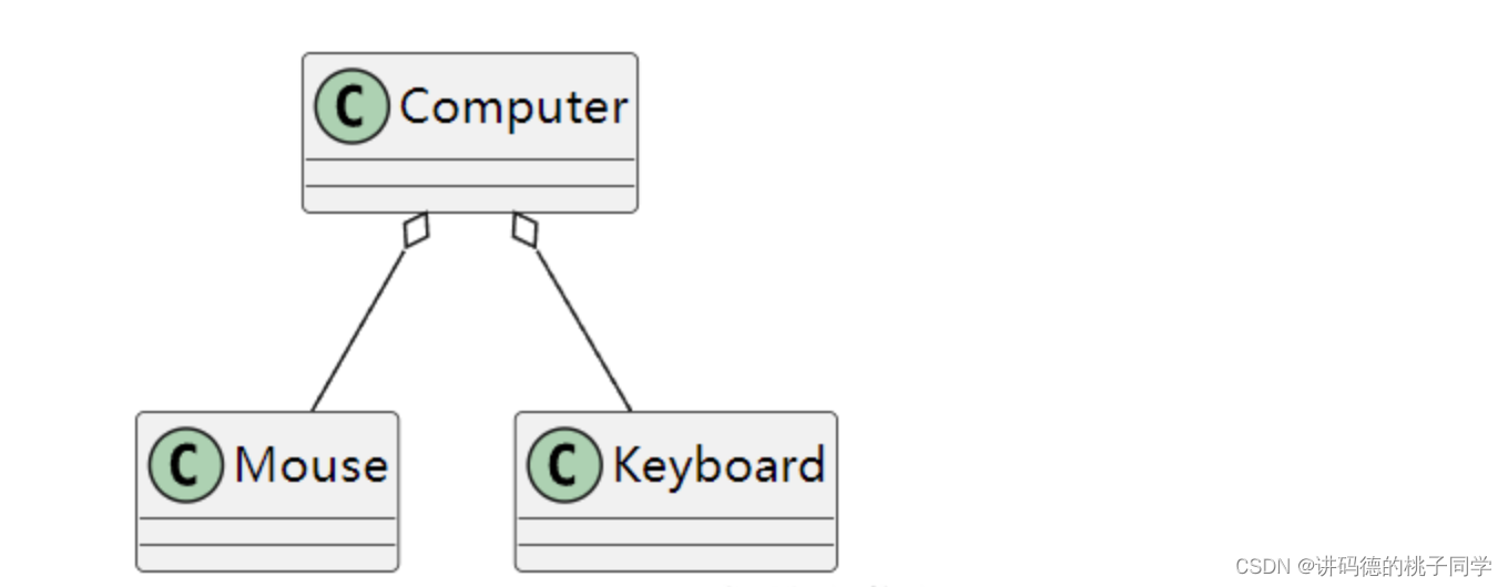 聚合是关联关系的一种特例,它体现的是整体与部分的关系,即 has-a 的关系。此时整体与部分之间是可分离的,它们可以具有各自的生命周期,部分可以属于多个整体对象,也可以为多个整体对象共享。例如电脑和鼠标键盘的关系,电脑作为整体,而鼠标键盘作为电脑的非必要组成部分,两者生命周期互不干扰。