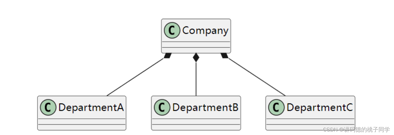 和聚合不同,组合中整体和部分是强依赖的,整体不存在了部分也不存在了。比如公司和部门,公司没了部门就不存在了。但是公司和员工之间属于聚合关系,因为公司没了员工还在。
