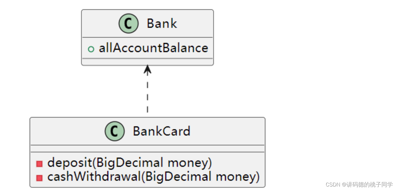 依赖关系用由类 A 指向类 B 的带箭头虚线表示: