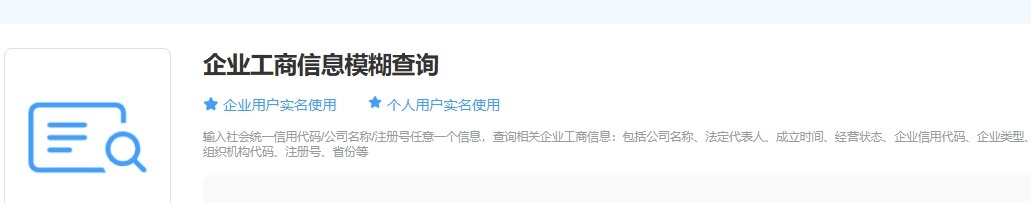 所谓模糊查询,就是用户无需输入精确的企业名称或其他信息,只需通过输入社会统一信用代码、公司名称或注册号等任意一个信息进行查询,API 接口就能在庞大的企业工商信息数据源中,检索出与之匹配的相关企业信息。接口返回的企业工商注册信息包括:企业名称、法定代表人、注册资本、经营范围、注册地址等。