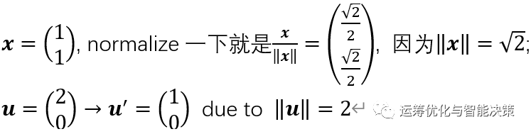 一个向量除以它的长度, 就会得到沿该向量方向的一个单位向量unit vector, 这个操作也叫做normalize, 标准化或规范化。就是变成一个单位长度的向量。