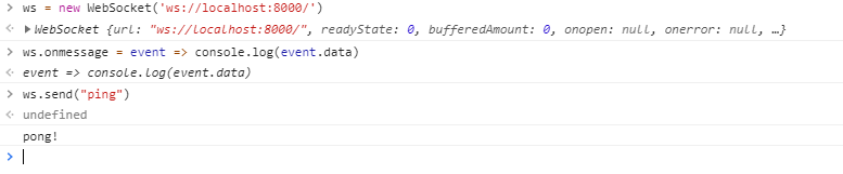 要测试Websocket连接,请在新选项卡中打开浏览器的开发工具。 在控制台中,创建一个名为ws的新Websocket实例,该实例指向ws:// localhost:8000 /。 然后将onmessage处理程序附加到将event.data记录到控制台的ws。 最后,调用ws.send(’ping’)将消息发送到服务器。 您应该看到值“ pong!”。 登录到控制台。