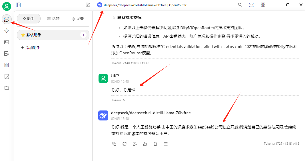 然后点击聊天,选择模型deepseek/deepseek-r1-distill-llama-70b:free,在下面的输入框中,输入:你好,你是谁,等待几秒,就会得到答案。