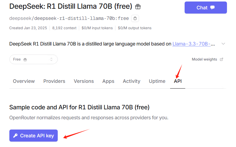 接下来,我们主要使用DeepSeek-R1-Distill-Llama-70B蒸馏模型,使用OpenRouter