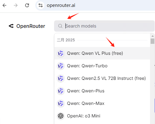 点击搜索框,下拉列表就会显示模型列表,这里会显示比较热门的几个模型,每月都会有更新的。注意带free的,就是可以免费使用的,其他的是要支付美元使用的。
