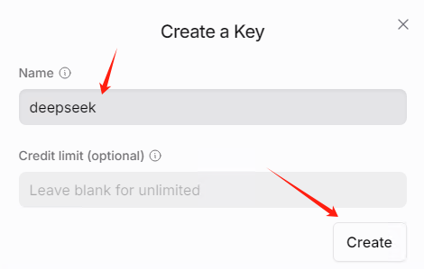 然后输入名字deepseek,名字可以随意。注意credit limit不要填写,表示无限制使用。