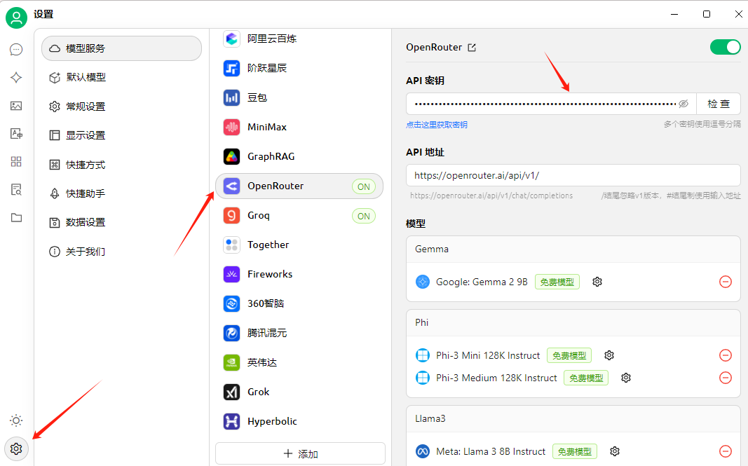 点击设置按钮,找到OpenRouter,输入API密钥