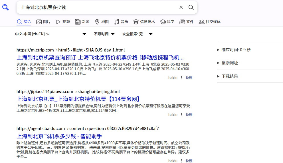 http://10.44.32.14:8081/search?q=上海到北京机票多少钱&format=json