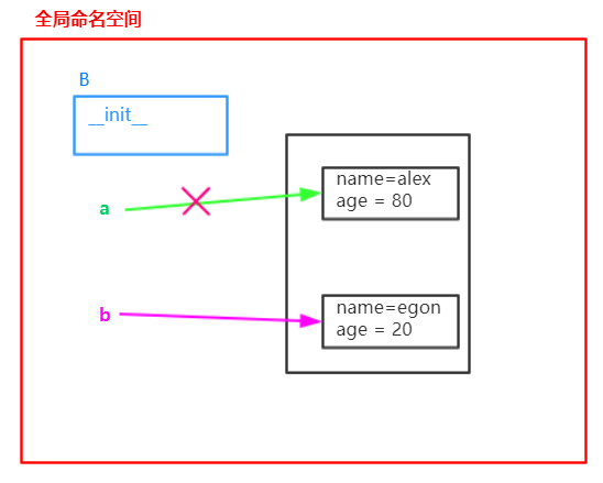 b实例化时,a对象的值指向就中断了。由于a和b共用一个内存空间,所以最终结果为egon