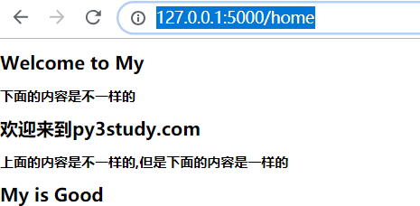 <!DOCTYPE html> <html lang="en"> <head> <meta charset="UTF-8"> <title>Title</title> </head> <body> <h1>Welcome to My</h1> <h2>下面的内容是不一样的</h2> {% block content %} {% endblock %} <h2>上面的内容是不一样的,但是下面的内容是一样的</h2> <h1>My is Good</h1> </body> </html>