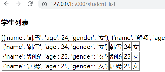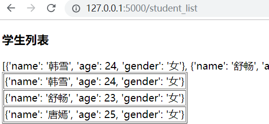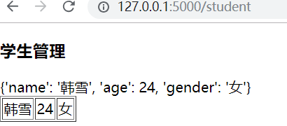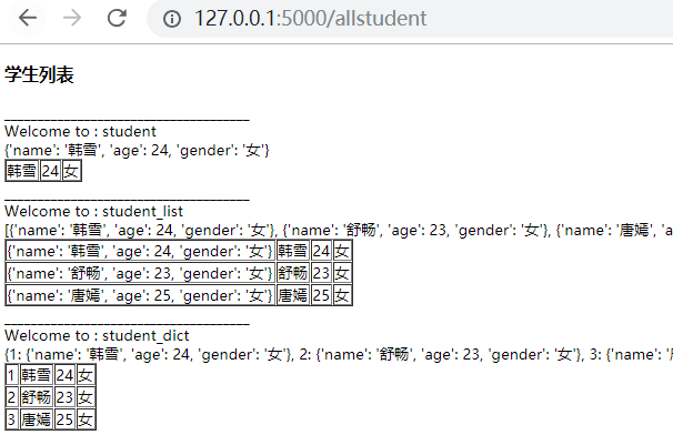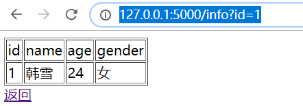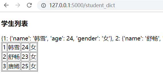 <!DOCTYPE html> <html lang="en"> <head> <meta charset="UTF-8"> <title>Title</title> </head> <body> <table border="1px"> <thead> <tr> <td>id</td> <td>name</td> <td>age</td> <td>gender</td> </tr> </thead> <tbody> <tr> <td>{{ stu_id }}</td> <td>{{ student.name }}</td> <td>{{ student["age"] }}</td> <td>{{ student.get("gender") }}</td> </tr> </tbody> </table> <div><a href="/student_list">返回</a></div> </body> </html>