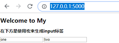 <!DOCTYPE html> <html lang="en"> <head> <meta charset="UTF-8"> <title>Title</title> </head> <body> <h1>Welcome to My</h1> {#type_text接收2个参数name,type#} {% macro type_text(name,type) %} {#渲染2个参数#} <input type="{{ type }}" name="{{ name }}" value="{{ name }}"> {% endmacro %} <h2>在下方是使用宏来生成input标签</h2> {#执行宏定义#} {{ type_text("one","text") }} {{ type_text("two","text") }} </body> </html>