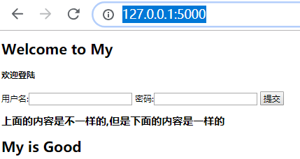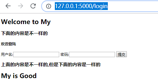 <!DOCTYPE html> <html lang="en"> <head> <meta charset="UTF-8"> <title>Title</title> </head> <body> <h1>Welcome to My</h1> {% include "login.html" %} <h2>上面的内容是不一样的,但是下面的内容是一样的</h2> <h1>My is Good</h1> </body> </html>
