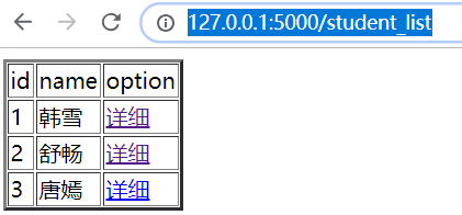 <!DOCTYPE html> <html lang="en"> <head> <meta charset="UTF-8"> <title>Title</title> </head> <body> <table border="2xp"> <thead> <tr> <td>id</td> <td>name</td> <td>option</td> </tr> </thead> <tbody> {% for foo in student %} <tr> <td>{{ foo }}</td> <td>{{ student[foo].name }}</td> <td><a href="/info?id={{ foo }}">详细</a></td> </tr> {% endfor %} </tbody> </table> </body> </html>