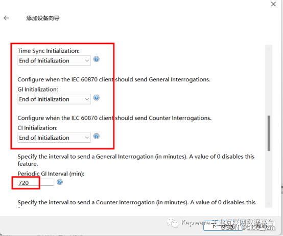 2,设置时钟同步、总召、计数器召唤的初始化方式,默认即可。