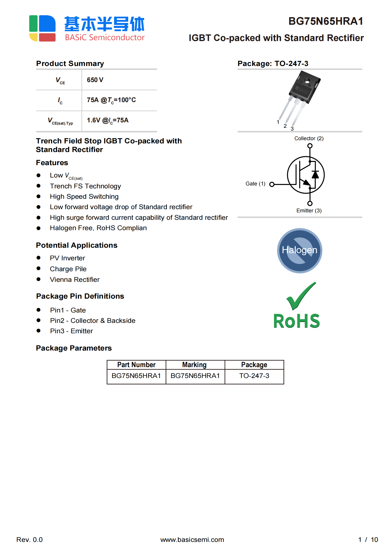 BG75N65HRA1凭借低损耗、高速开关、优异热管理及集成化设计,可显著提升充电桩维也纳整流器的功率密度、效率和可靠性,同时简化系统设计,是高频高功率PFC应用的理想选择。实际应用中需结合驱动电路优化(如栅极电阻匹配)和散热设计(如强制风冷/散热片),以充分发挥其性能潜力。