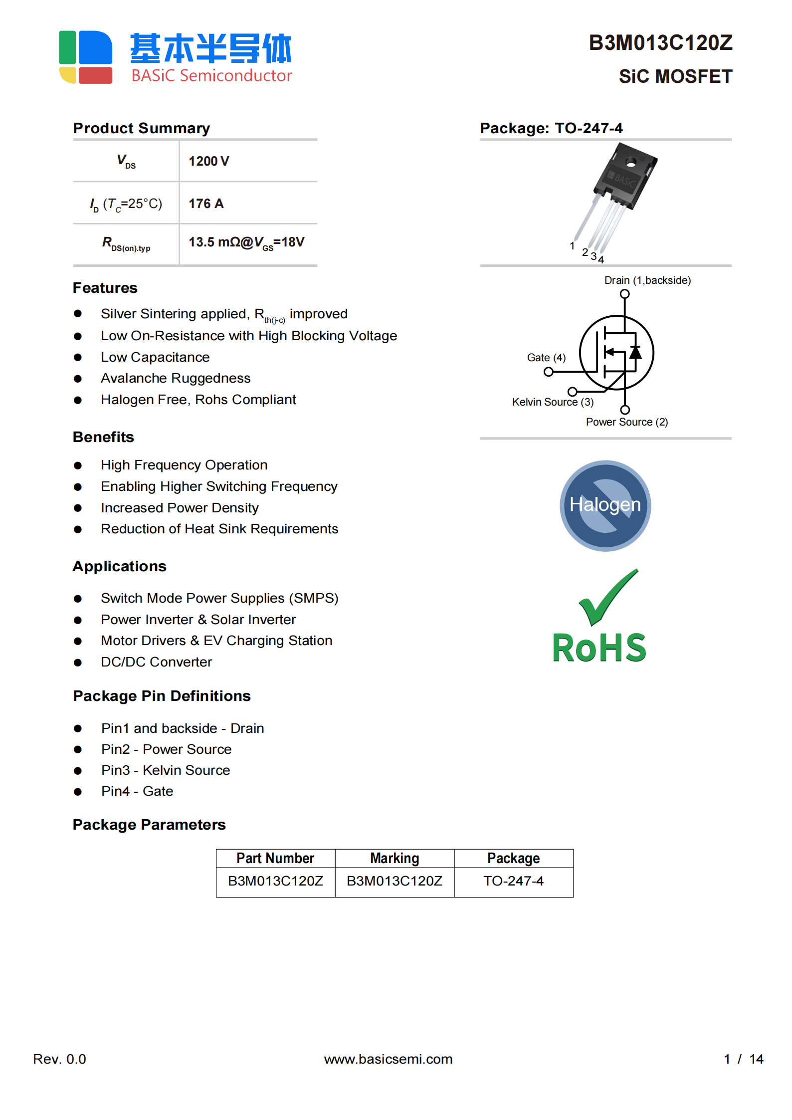 B3M013C120Z(1200V/176A,RDS(on)=13.5mΩ)用于高压侧(全桥拓扑)。