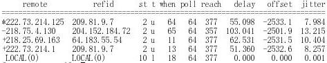 remote:即NTP主机的IP或主机名称。注意最左边的符号,如果由“+”则代表目前正在作用钟的上层NTP,如果是“*”则表示也有连上线,不过是作为次要联机的NTP主机。
