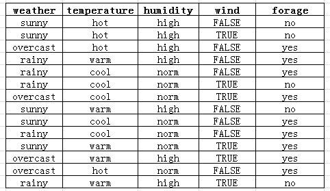 它记录了再不同的天气状况下,是否出去觅食的数据。