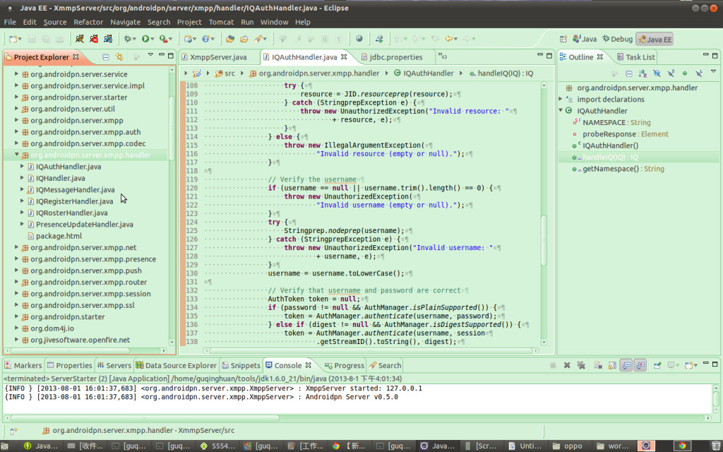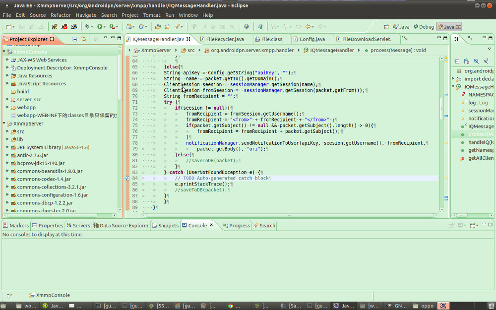 将XmmpServer.part1.rar,XmmpServer.part2.rar,XmmpServer.part3.rar解压后得到XmmpServer将其导入eclipse(Eclipse Java EE IDE for Web Developers)后有两个project:XmmpServer和XmmpConsole