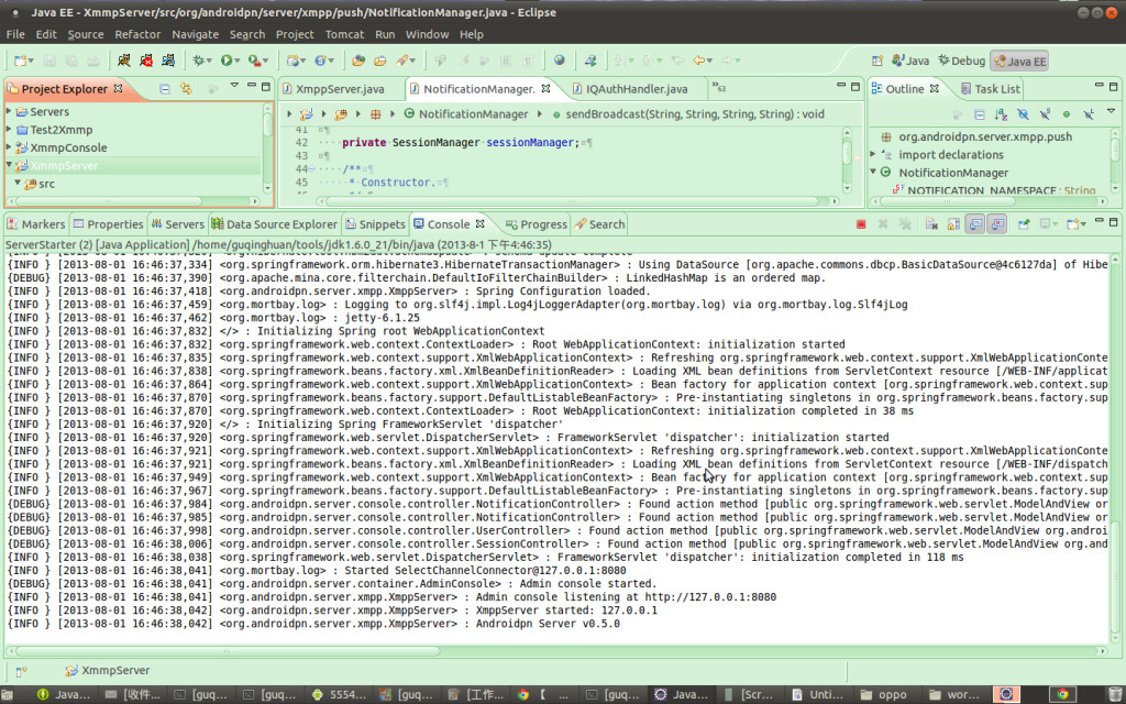 此时浏览中页面的实现在XMMPCONSOLE项目中,XMMPCONSOLE中的功能通过SESSIONMANAGER,NOTIFICATIONMANAGER来与XMMPSERVER交互实现