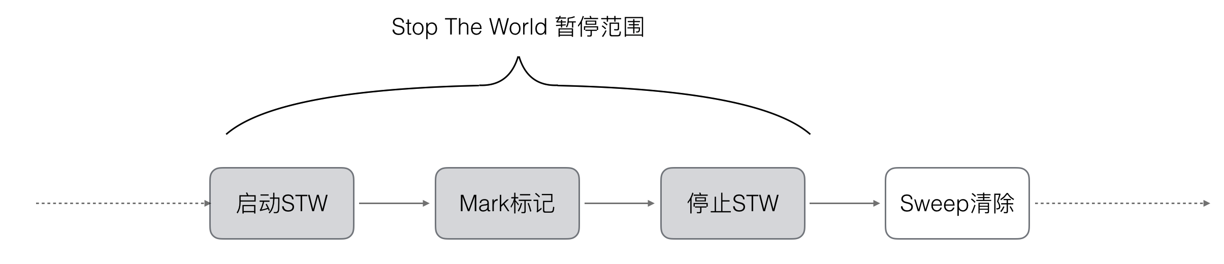 Go V1.3版本之前就是以上来实施的, 在执行GC的基本流程就是首先启动STW暂停,然后执行标记,再执行数据回收,最后停止STW,如图所示。